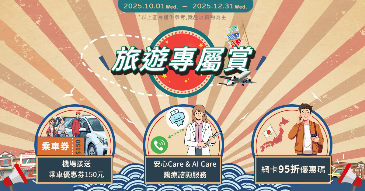 投保海外旅遊地區之「旅綜險」不限金額與方案並完成付款者,即可獲得「ZUDAO機場接送乘車優惠券150元」。