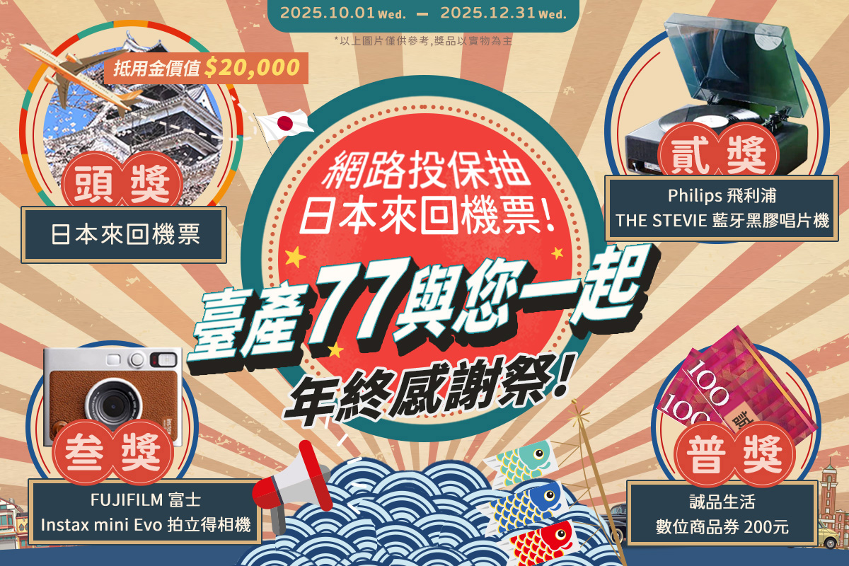 車險喬遷獎:該汽/機車前一期任意險非網路投保臺灣產物保險者,於活動期間完成網路投保臺灣產物保險「強制險+任意險」即可加碼抽「家樂福數位商品禮券200元購物金」共50名。