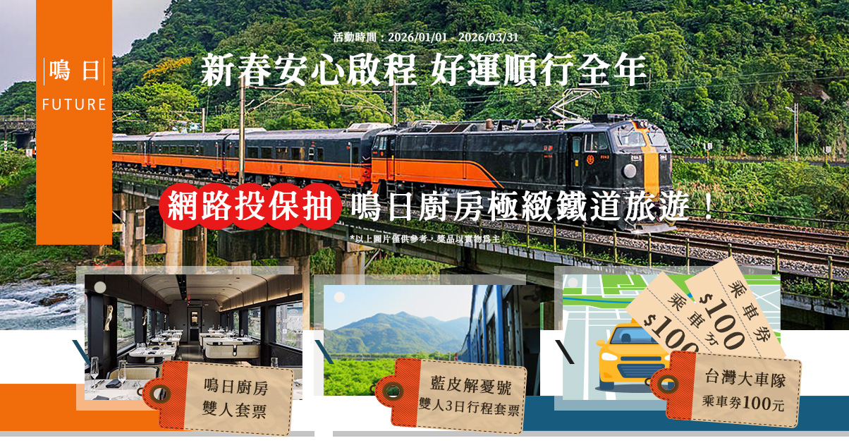 網路投保【強制險+任意險】,即可抽鳴日廚房雙人行、藍皮解憂號雙人行程、台灣大車隊乘車券…等多項大獎。 |