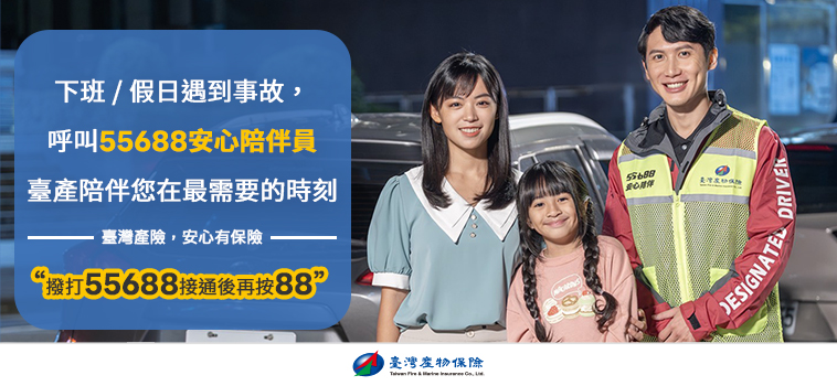 車禍不是任何人願意面對的事情,但在最無助的那一瞬間,如果有人願意給予支持,那份安心,就是我們希望帶給每位保戶的力量。臺灣產物保險和台灣大車隊55688合作的「安心陪伴服務」,是在您徬徨無助的狀況下,有人能站在您身邊、穩定您的情緒、提醒您的安全並與您一起等待警方抵達。我們相信,保險不僅是提供經濟保障,更是在事故發生時,真正能讓您安心的陪伴與支援。